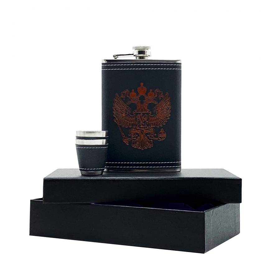 Для удобства фляжка покрыта стильным кожаным чехлом изображением Герба России